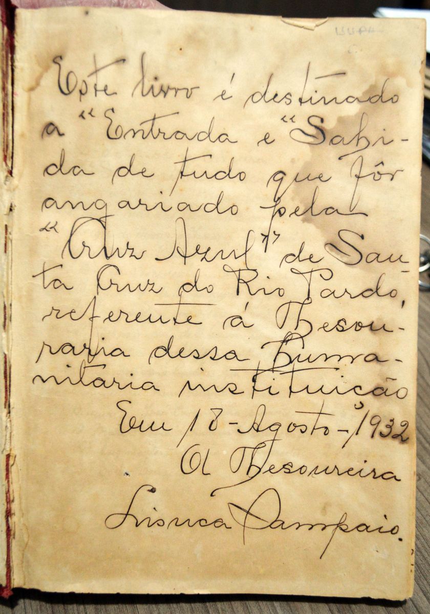 A tesoureira do movimento era Lizuca Sampaio, mulher do médico Pedro César Sampaio. Ela elaborou um “Livro de Ouro” que foi guardado pelo neto, Roberto Gonzaga de Oliveira. Em sua primeira página, com a data de 18 de agosto de 1932, “Dona” Lizuca escreveu: “Este livro é dedicado à “Entrada e Saída” de tudo o que for arrecadado pela Cruz Azul de Santa Cruz do Rio Pardo referente à tesouraria desta humanitária instituição”.